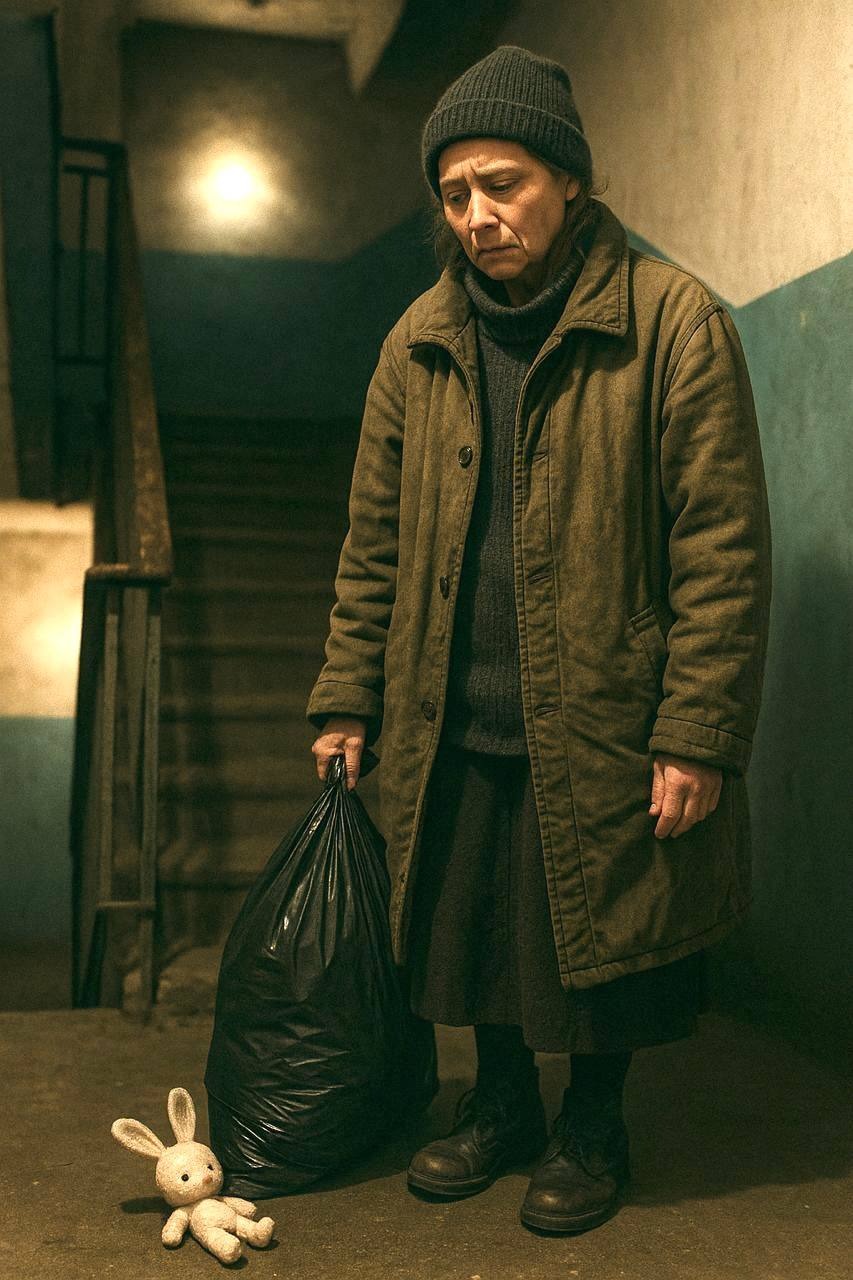 Abre el conducto de basura… y entonces se le cae la bolsa. Al suelo no cae solo basura doméstica, sino que por encima rueda un pequeño juguete infantil. Un conejito de plástico sin oreja.