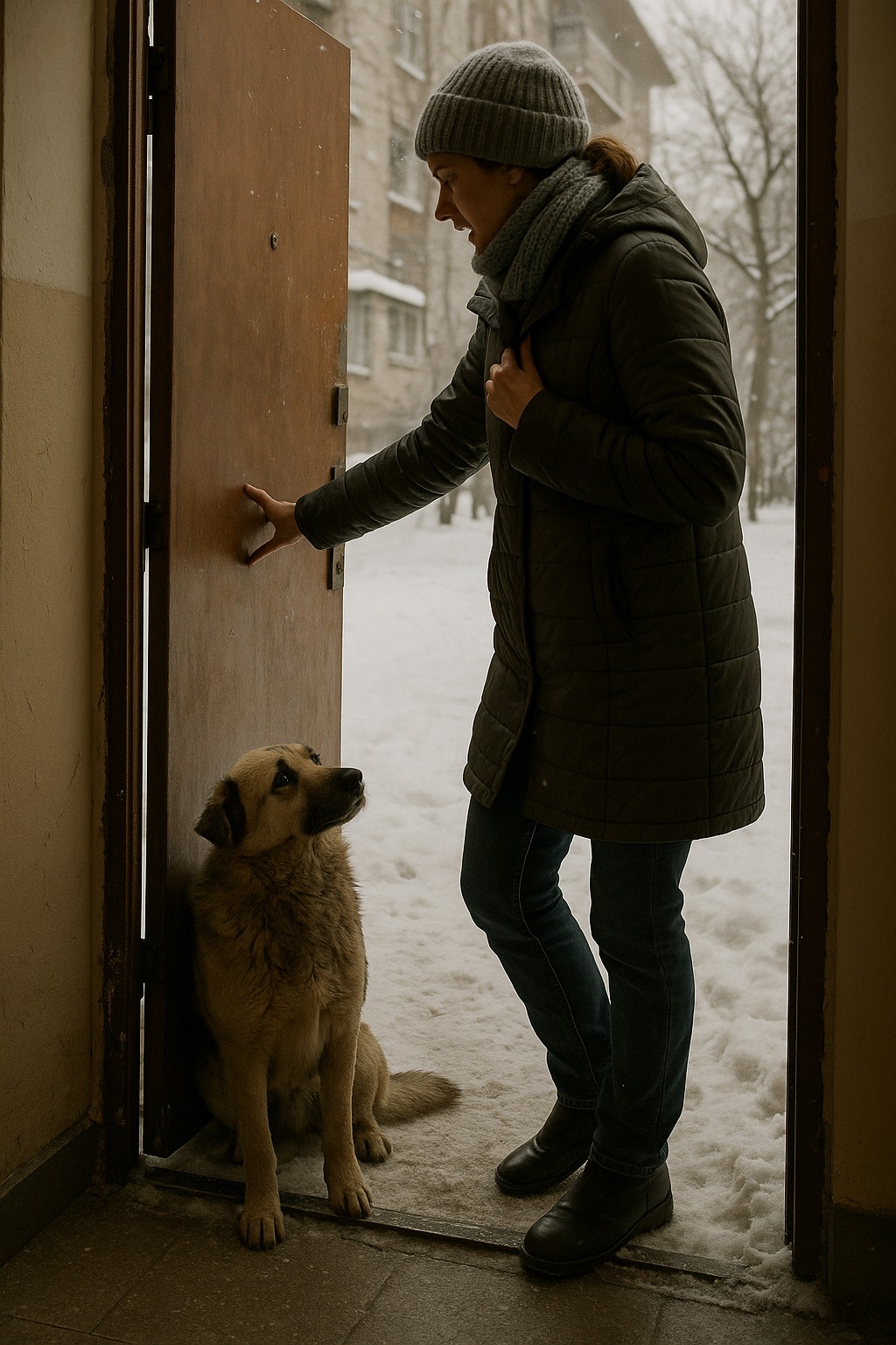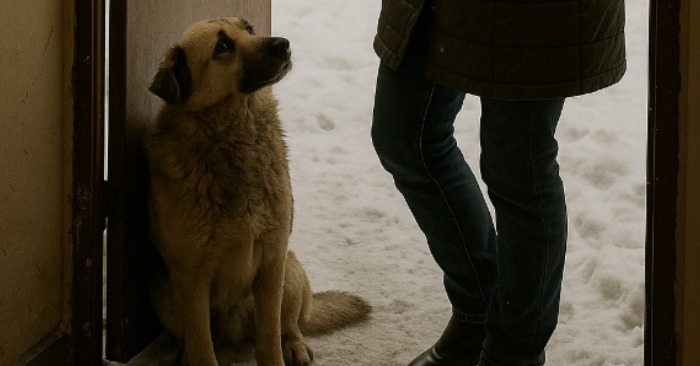 Esa noche, Anya regresaba tarde a casa. Era diciembre, la nieve crujía bajo sus pies y el aire frío le quemaba los pulmones. En la entrada, vio a un perro flaco. Estaba sentado junto a la pared, temblando, con las patas pegadas al vientre. Tenía los ojos tan tristes y cansados que a la mujer se le encogió el corazón.