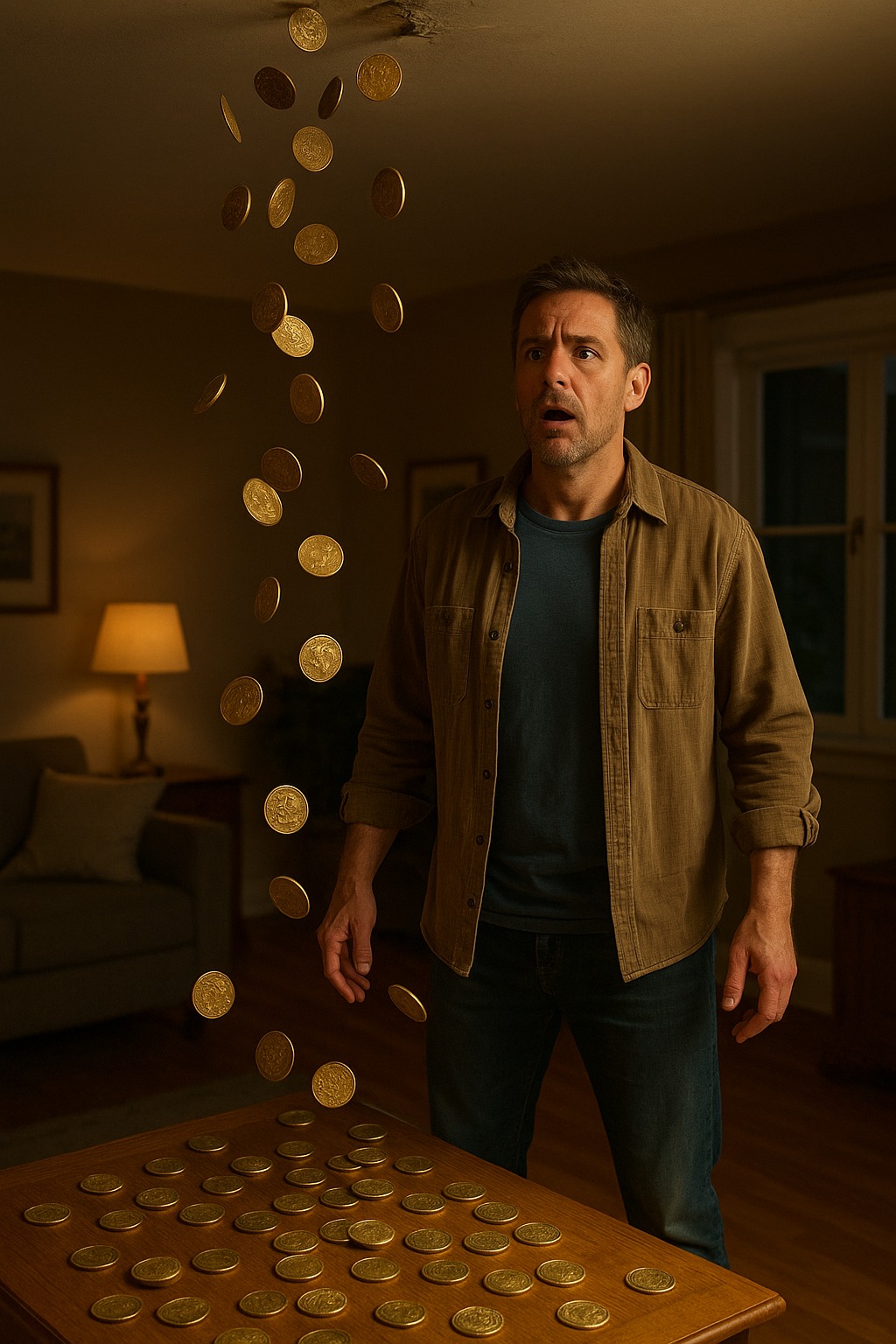 Esa noche, incapaz de dormir, se sentó en la oscuridad de la sala de estar. Exactamente a las 3:12 a. m., el techo sobre él comenzó a ondular, como el agua agitada por una piedra. Las monedas comenzaron a gotear, luego a caer, lloviendo sobre el suelo. Y mientras miraba hacia arriba, algo más emergió.