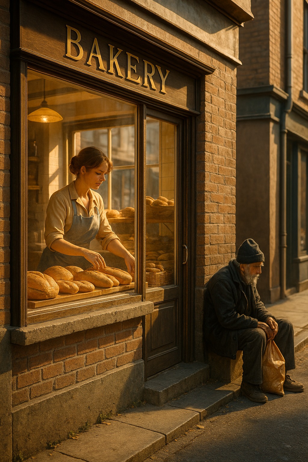 Y junto a ella, un anciano sin hogar, sentado en un escalón, comiendo el mismo pan que ella horneaba cada mañana.