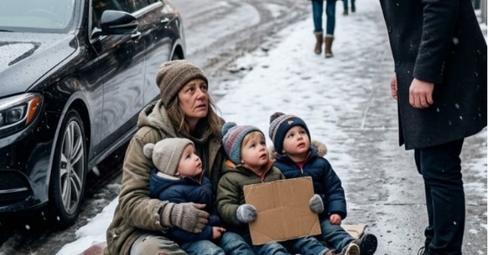 Al otro lado de la calle, junto a una tienda cerrada, apoyada contra la pared, una mujer estaba sentada en el suelo frío, envuelta en un abrigo fino y desgastado. Tres niños pequeños se acurrucaban a su lado, intentando entrar en calor. En su mano sostenía un trozo de cartón: «Por favor, ayúdenme. Cualquier ayuda es bienvenida».